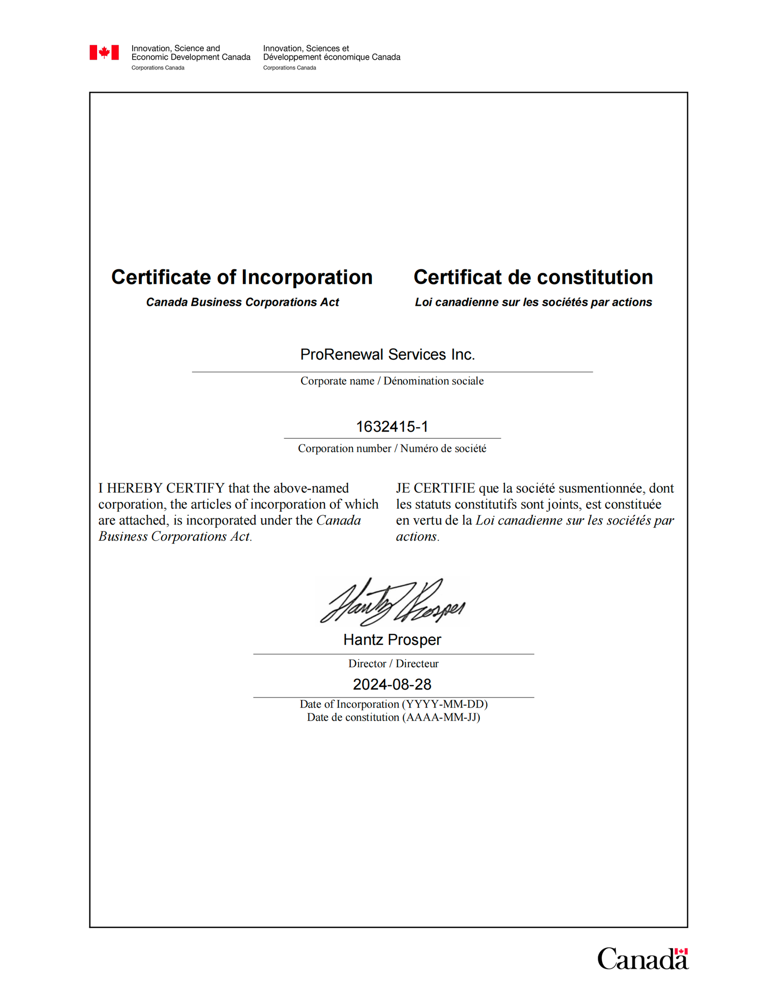 ProRenewal Services Inc. is a legally registered Canadian corporation incorporated under the Canada Business Corporations Act.